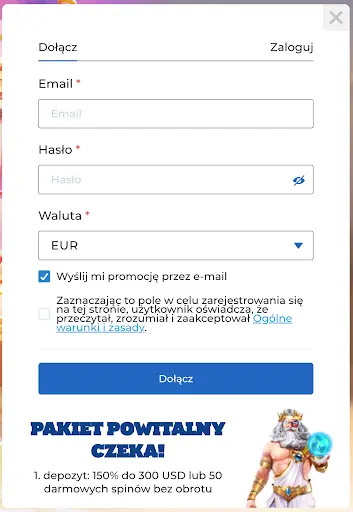 Wejdź na oficjalną stronę AMPM Casino i w prawej górnej części ekranu kliknij przycisk „Dołącz”. Wypełnij formularz, podając swój adres e-mail, hasło oraz walutę (np. PLN).