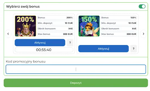 Po pomyślnym wpłaceniu depozytu, bonus powinien pojawić się w Twoim profilu w zakładce z bonusami. Jeśli nie widzisz go od razu – odśwież stronę lub skontaktuj się z obsługą klienta.