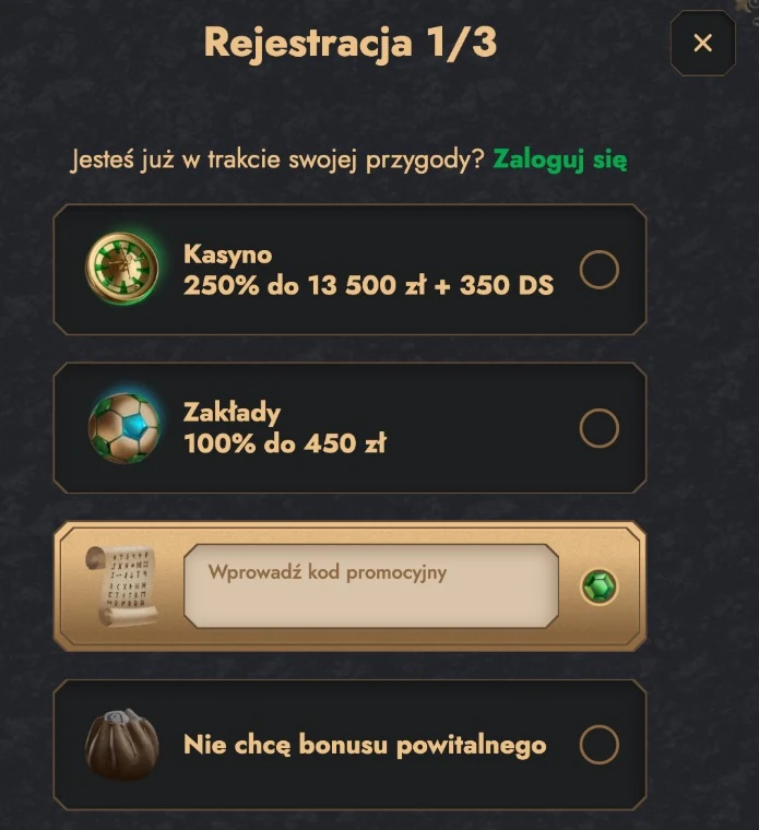 - Z dostępnych promocji powitalnych wybierz „Mam kod promocyjny”.