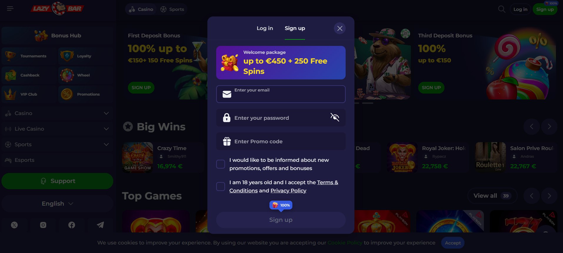 Będąc w posiadaniu kodu promocyjnego, najlepiej wykorzystać go jak najszybciej. Będzie to wymagać rejestracji nowego konta, jeśli promocja dotyczy nowych graczy. Rejestracja w kasynie Lazybar jest darmowa, więc nie będzie trzeba za nic płacić.